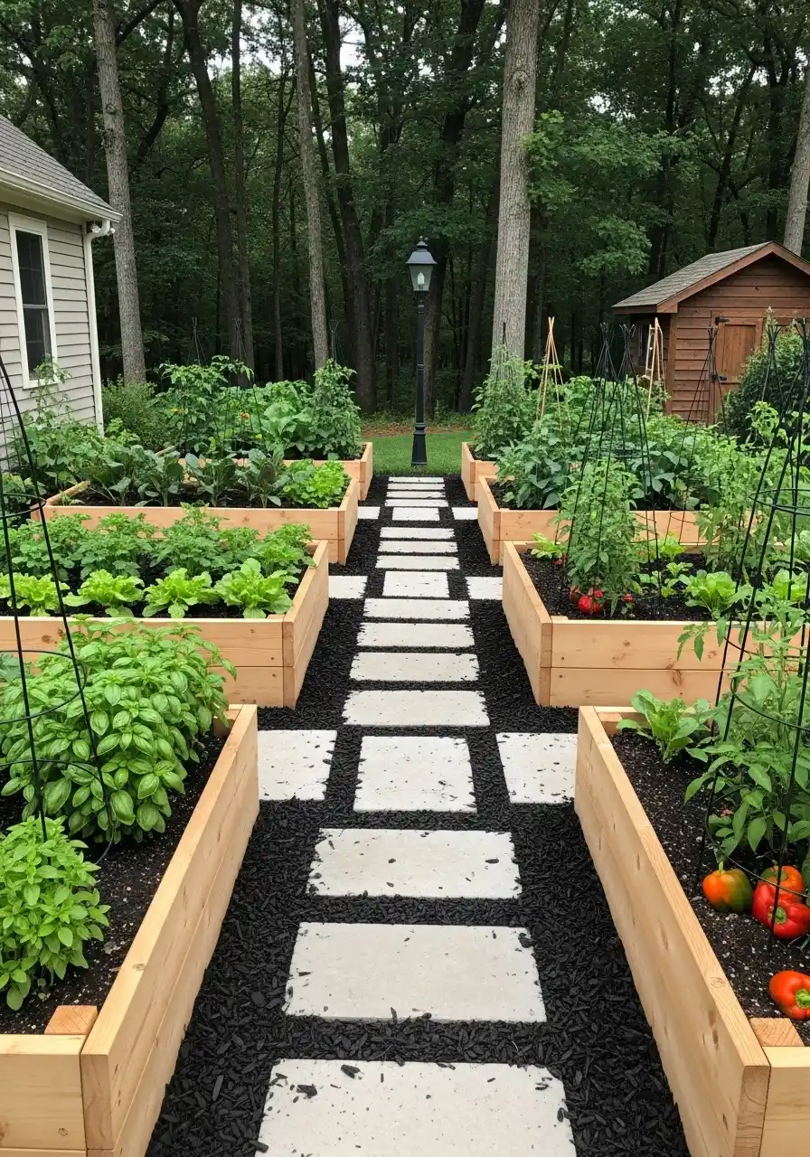 This setup has a bold walkway down the middle, and raised beds are lined up on both sides like they’re in formation. It’s super practical. You can carry a watering can straight down without zig-zagging like a confused chicken. The stepping stones also keep your shoes from turning into mud bricks.