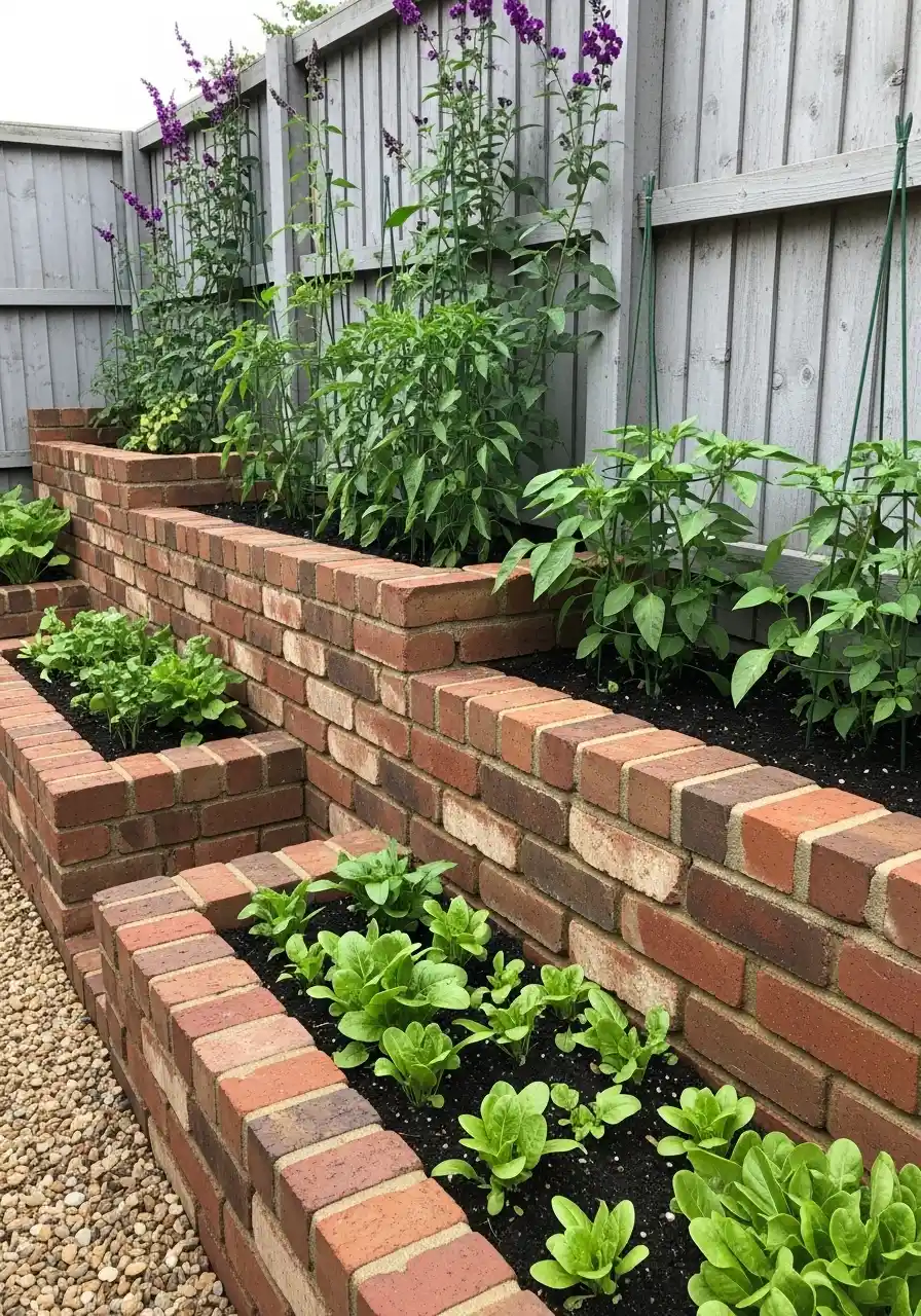Tiered brick beds along a fence for small yards (and big plant energy)