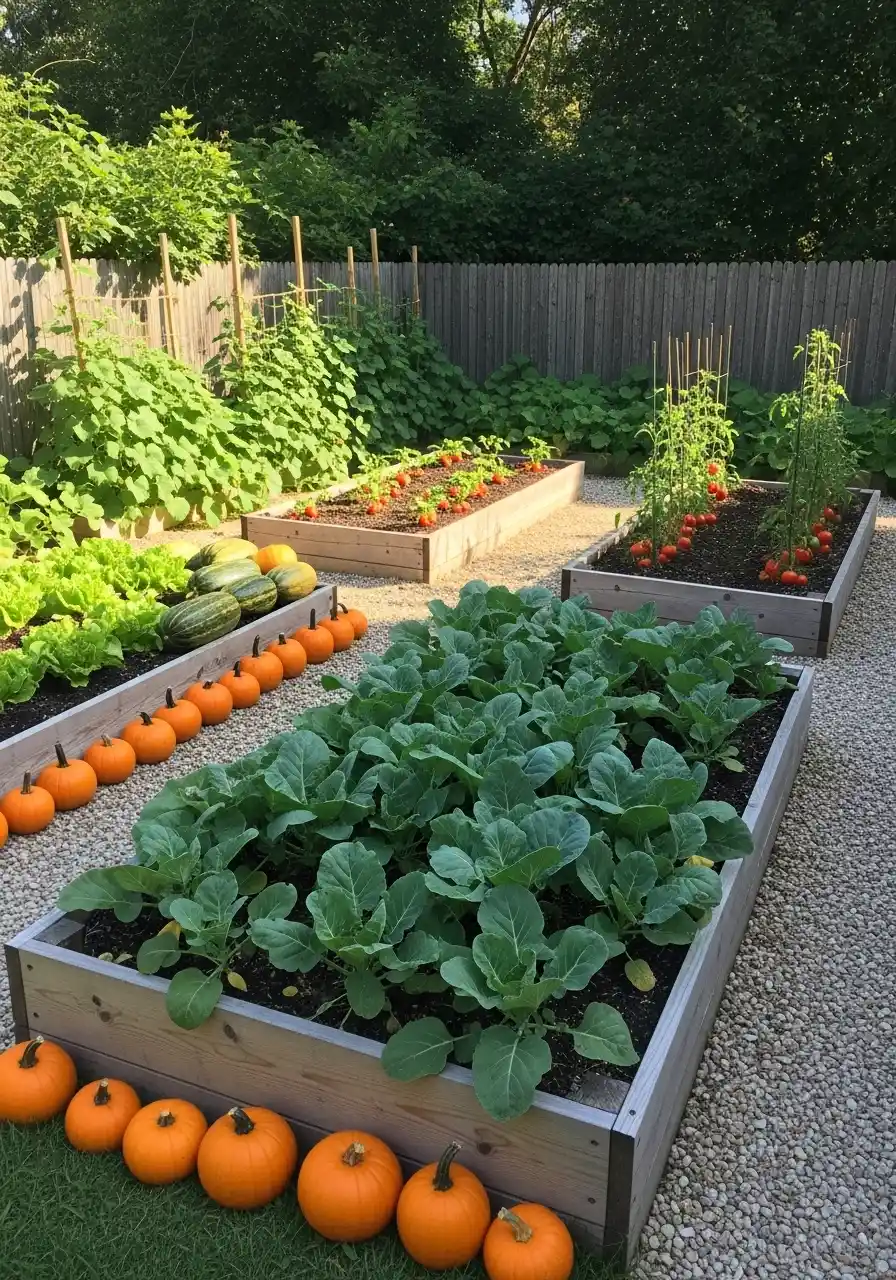 If you want to try this border around my vegetables vibe, do it when your plants start fading and you need a mood boost. Pumpkins, gourds, even pots of mums can frame the beds. My trick: group pumpkins by color or size so it looks intentional, not like you dropped groceries. And if you want a more lasting veg garden edge, add a simple wood strip under the pumpkins so they don’t sit in wet gravel and rot too fast. It’s cozy, it’s playful, and it makes me want soup.