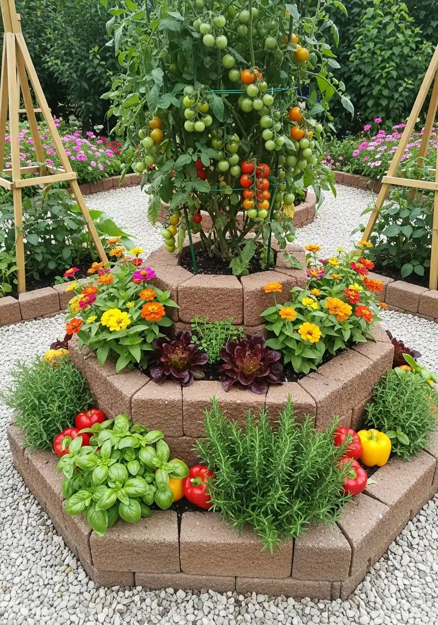 That round stacked planter is kind of genius. It’s like a stage for your tomato plant, with herbs and flowers hugging the lower rings. I love it because it makes one plant feel important, which sounds silly, but it makes me want to actually take care of it. The block border also holds heat, so tomatoes ripen a bit faster. That’s a real win.