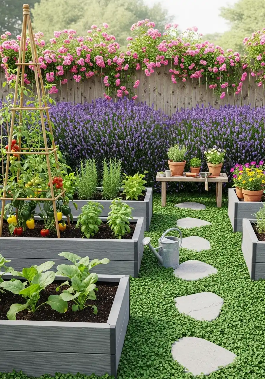 This one feels like a backyard you’d actually hang out in. The stepping stones through the green groundcover make it feel relaxed, not strict. Then there’s that big purple border in the back (lavender style) and pink blooms above the fence, which makes the whole space feel cozy. I like a vegetable garden border that feels friendly, not like a science project.