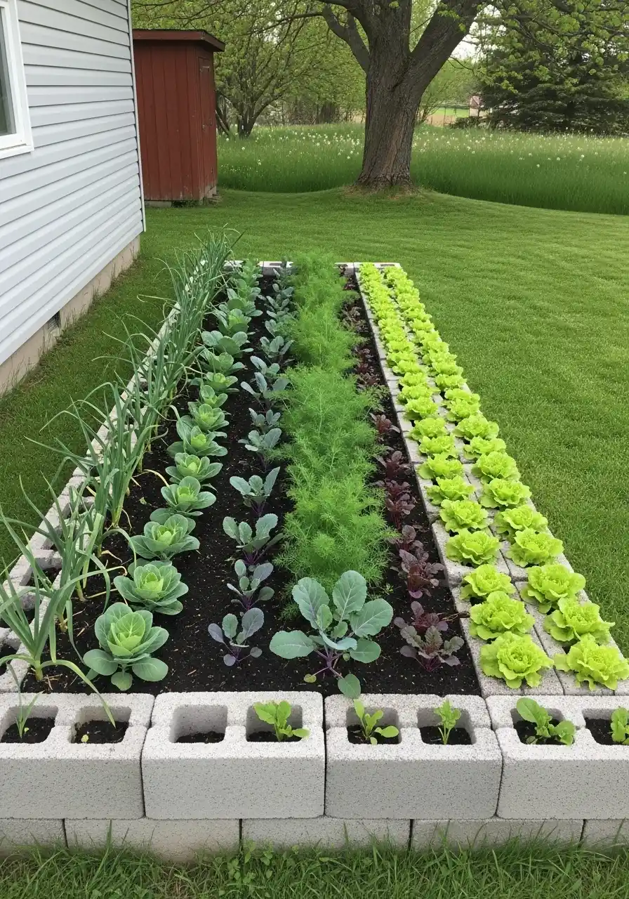 If you want this, level the ground first or the blocks will lean and annoy you forever. Fill the bed with good soil, then plant in rows like the photo shows. I like the row look because it’s easy to water and easy to replant. Use the block holes for basil, chives, or marigolds for a simple vegetable plot border that also helps with pests.