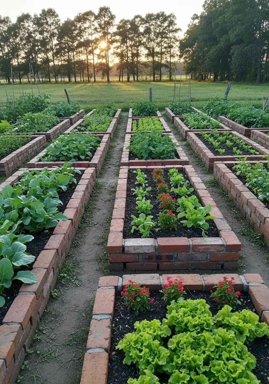 The brick beds with the simple layout feel solid and grown-up. A vegetable garden border like this basically says, “I’m serious about my tomatoes.” Brick holds heat too, so the soil warms up faster in spring. That means earlier planting, which always makes me feel smug for no reason.