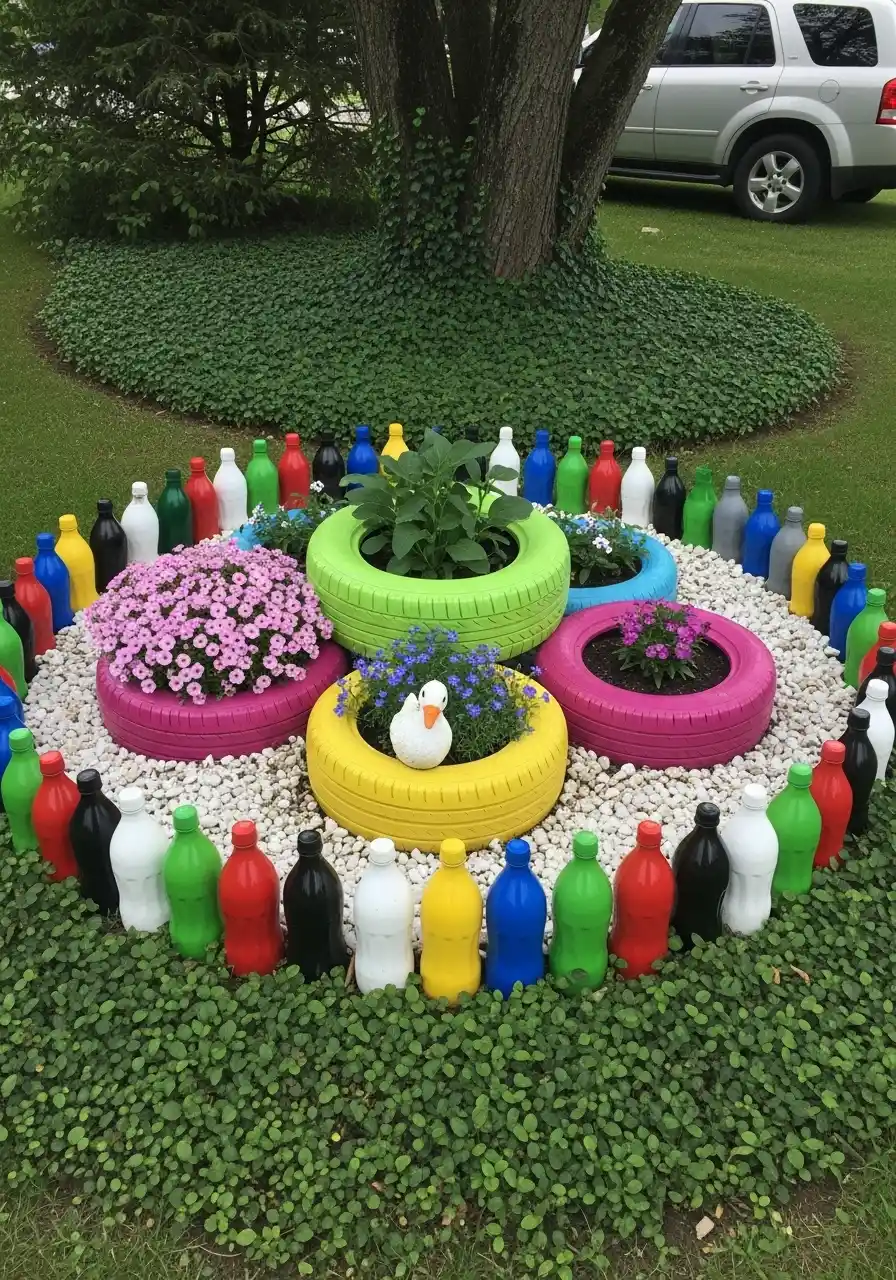 This last idea is more “use what you got.” There are painted bottles and bold recycled pieces, and it creates a bright little garden corner that feels cheerful. It’s not subtle. It’s loud, playful, and honestly kind of brave.