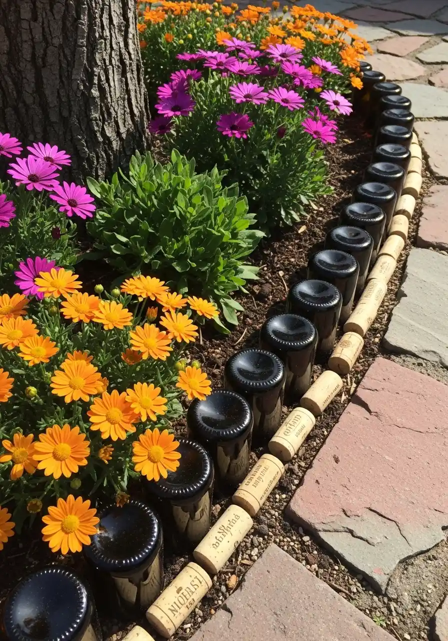 This one is honestly so clever I got mad I didn’t think of it first. Dark glass bottles upside down, lined tight, with a second row of corks right beside them. It’s like a double border, and it looks fancy even though it’s basically recycling. The wine bottle garden border here also acts like a clean edge between soil and pavers, which helps the whole area look finished.