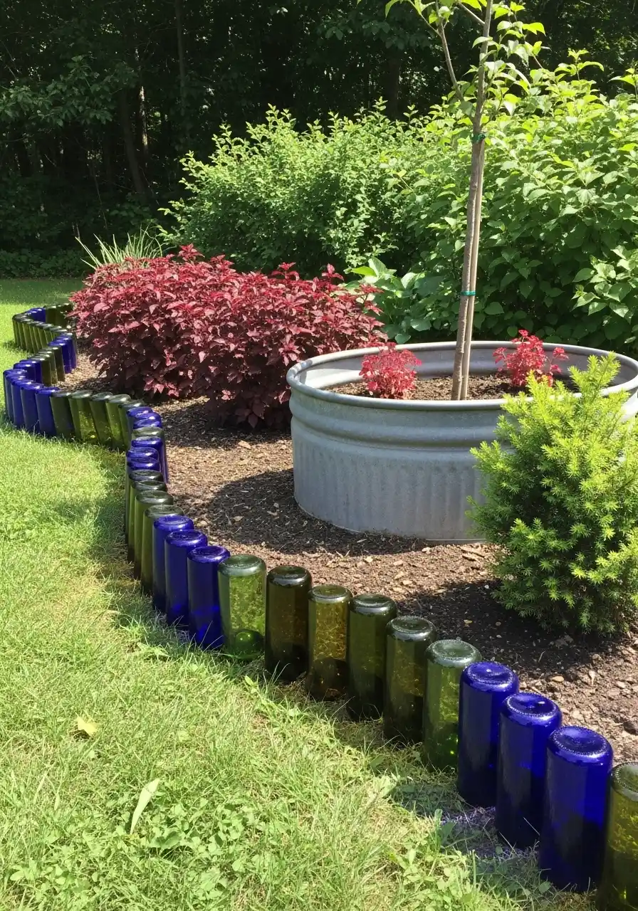 This idea uses bottles like little glass fence posts, curving around a planting area. Blue and green glass together looks super calm, like sea colors. A wine bottle garden border like this is great when the plants inside are mostly green too, because the glass becomes the color pop without screaming.