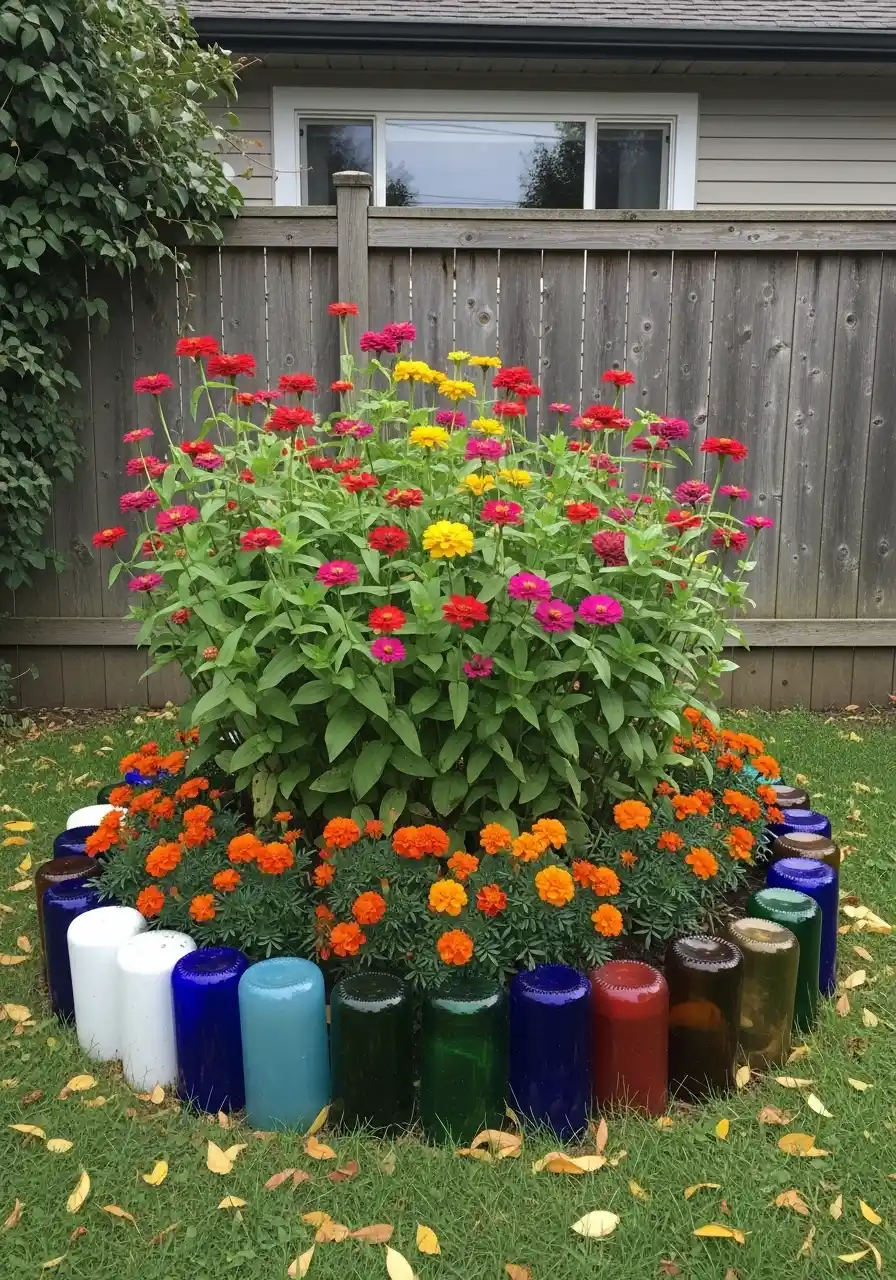 The big thing here is making it strong. Circular beds get stepped on more because people walk around them. I’d set bottles deeper than usual and pack crushed stone around them for stability. Also, consider using thicker bottles because thin glass can crack easier if the ground shifts. Plant-wise, put taller flowers in the middle and shorter flowers near the edge so the wine bottle border edging stays visible. Otherwise the plants swallow it and you lose the cool part.