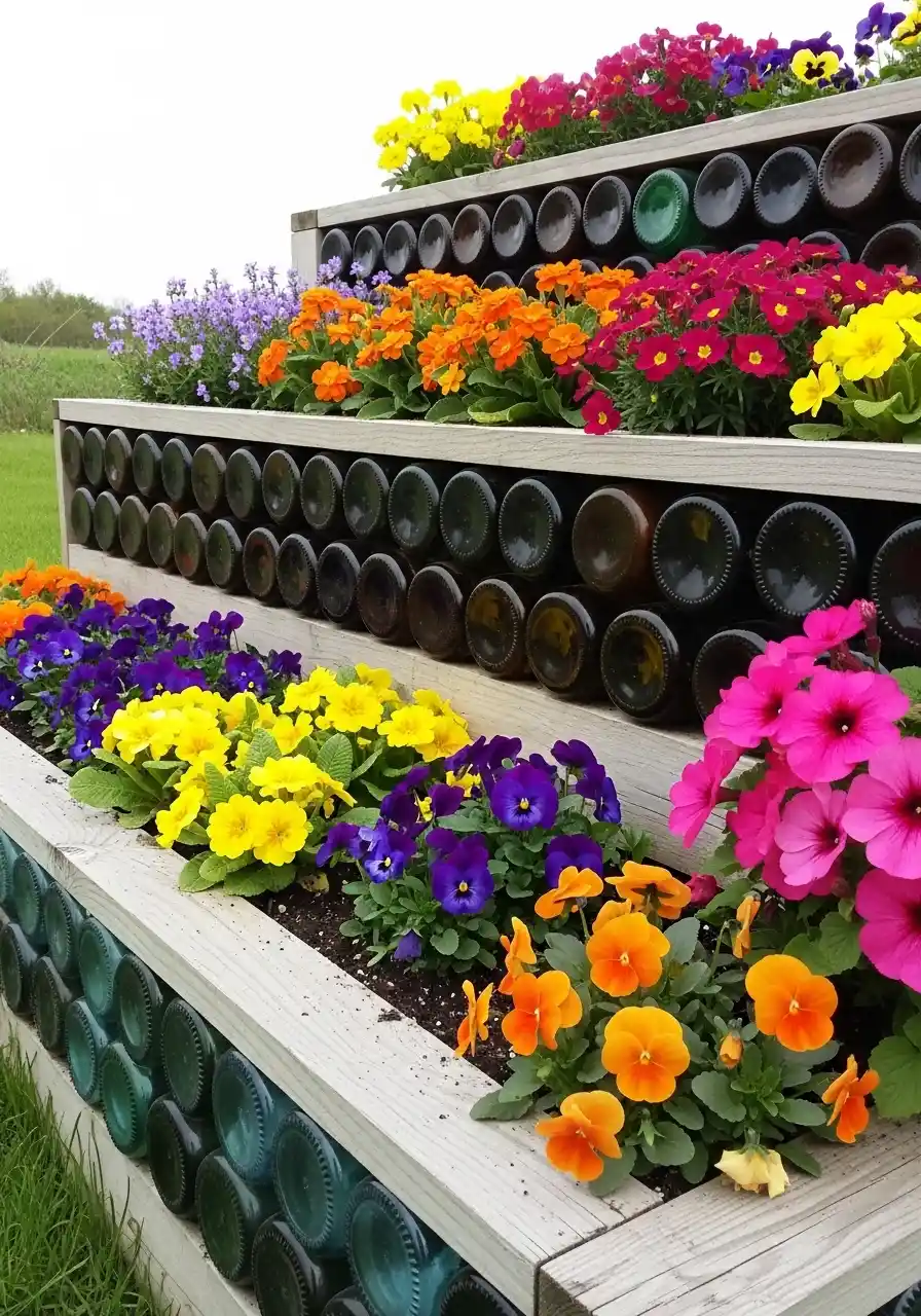 This last idea is kind of next level. It’s not just edging, it’s a whole raised planter built with bottle bottoms showing in rows. It looks like a honeycomb of glass circles. This is a wine bottle garden border turned into actual structure, and it’s honestly stunning when it’s packed with bright flowers.
