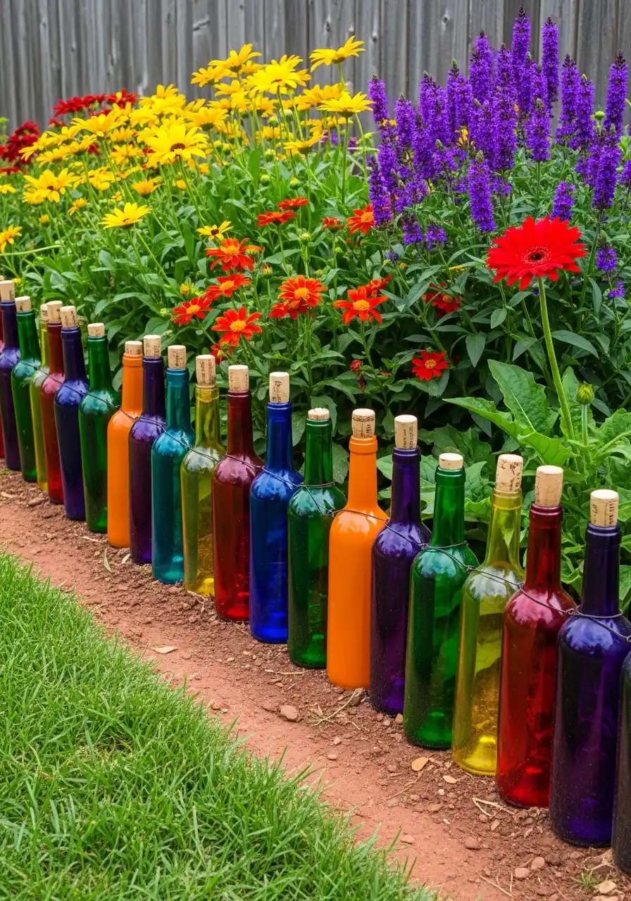 This is the loudest one and I love it. The bottles go in a long row along a walkway, and the plants behind them are airy and colorful, like wildflowers. The wine bottle garden border becomes its own art piece, like a stained-glass fence but lower. It makes the whole side yard feel playful instead of boring.