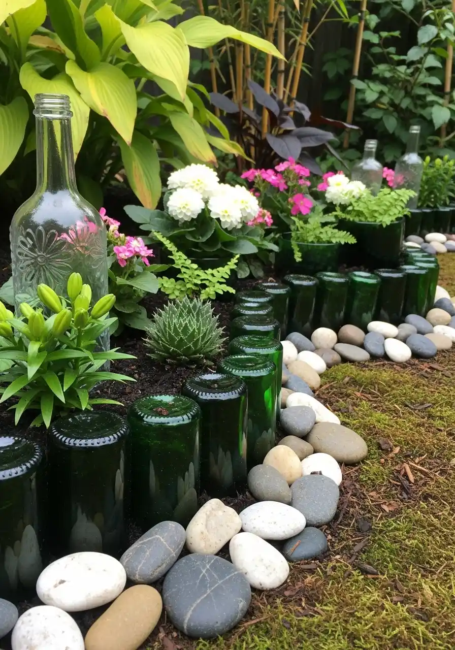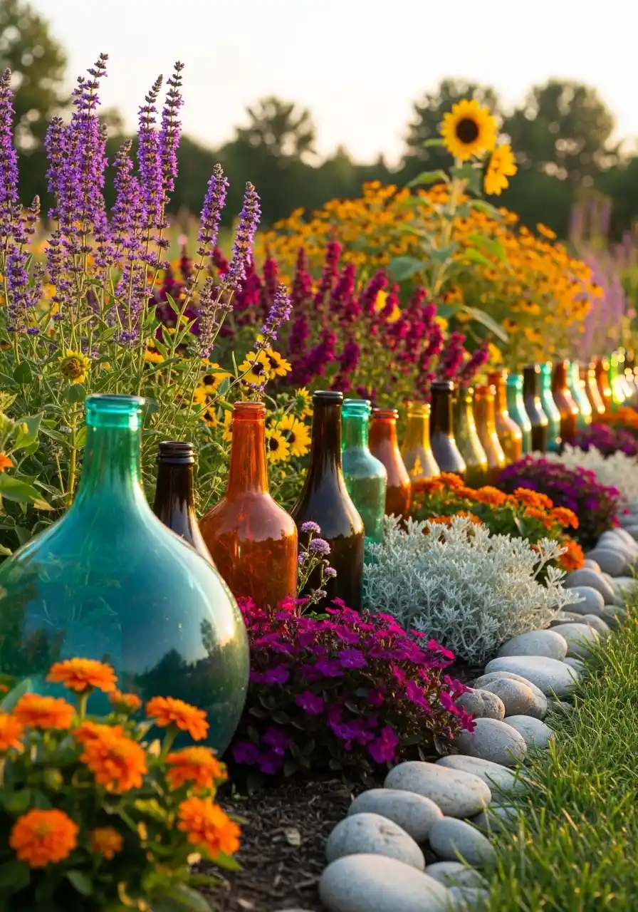 If you like a more relaxed bottle garden edge, don’t stress about matching bottles. Mix them. Mix shapes too. Just keep the line consistent so it still reads as a border, not random glass stuck in dirt.
